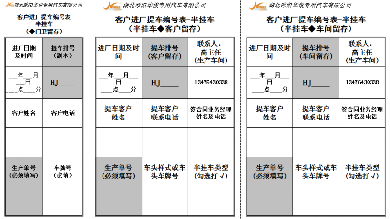 3、將此表《車間留存》交生產車間高主任13476430338,提車一切事宜不清楚請聯系高主任。
