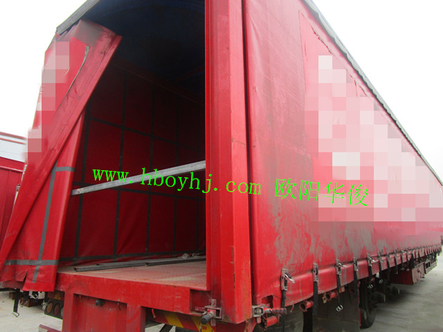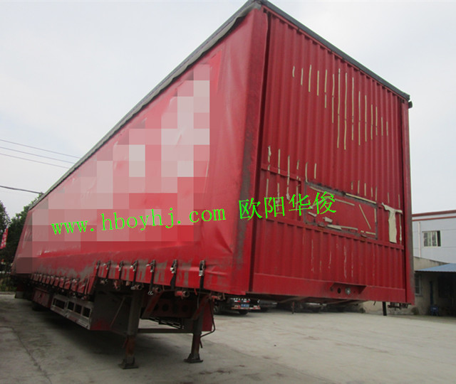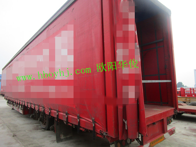 【二手車】舊17.5米×2.8米寬平板篷布卷簾半掛車廂低價出售,此平板式篷布卷簾車廂的尺寸為:17.5米長×2.8米寬×2米內高。是2016年1月訂做的,前站板中開40公分×120公分的小門,車身兩邊及后門為卷簾篷布,此篷布為進口的。