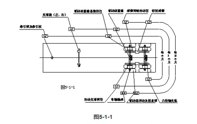 c.圖5-1-1是半掛車各部位潤滑脂補充圖。圖中表示出加油脂位置和加油時間,并要求使用下表規定的潤滑脂牌號(或類似品種)。三軸車或單軸車參見二軸車。車軸及懸掛處的潤滑脂牌號參見車軸及懸掛的使用說明書。