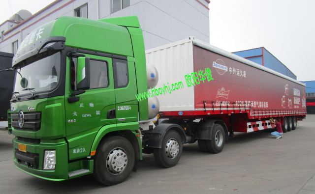 歐陽華俊蓬布側簾半掛車廂配陜汽德龍X3000 綠色LNG 牽引車圖片(1)