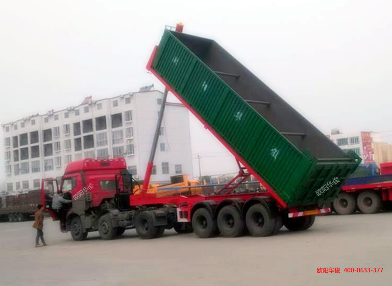平板自卸半掛車俗稱:平板后翻自卸半掛車,就是用于運輸集裝箱的平板自卸車。用于運輸煤炭、砂石、礦石、渣土等,湖北歐陽華俊專用汽車有限公司對每一個產品都經過工程師的精心設計與技術人員的出廠檢驗,具有自重輕、重心低、軸距短等特點。非常適合山路已及高速公路行駛。近日,我司工程師將新出廠的平板自卸車開入沙場進行自卸檢驗。滿滿的一集裝箱砂石,輕松卸完。贏得了客戶的好評,也證名了我司優質的產品質量。