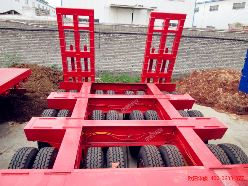 二氧化碳?xì)怏w保護(hù)焊接;整個(gè)車架經(jīng)噴丸處理,使車輛更美觀、堅(jiān)固耐用。采用車橋穿越大梁,有效降低了載貨平臺(tái)的離地高度,該車增大的通過能力可裝載更大直徑的物件,是適合運(yùn)輸風(fēng)電塔筒及大直徑貨物的理想運(yùn)輸工具。該車可按客戶要求做成抽拉式、中間做成圓弧形以便適應(yīng)大直徑圓形物件 三線六橋是指半掛車的一側(cè)大梁并列著三跟車軸,并串聯(lián),兩根大梁就是六根橋。