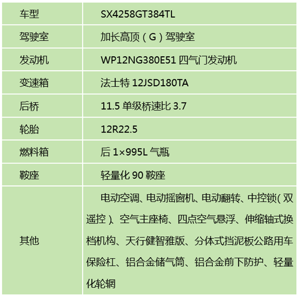 陜汽作為天然氣重卡的引領者,在保證產品質量和可靠性的前提下,在輕量化方面下足了功夫。請大家先來看看新M3000天然氣牽引車的產品配置和外觀照片: