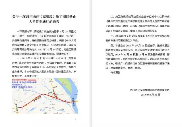 關于一環西拓南環(高明段)施工期間禁止大型貨車通行的通告