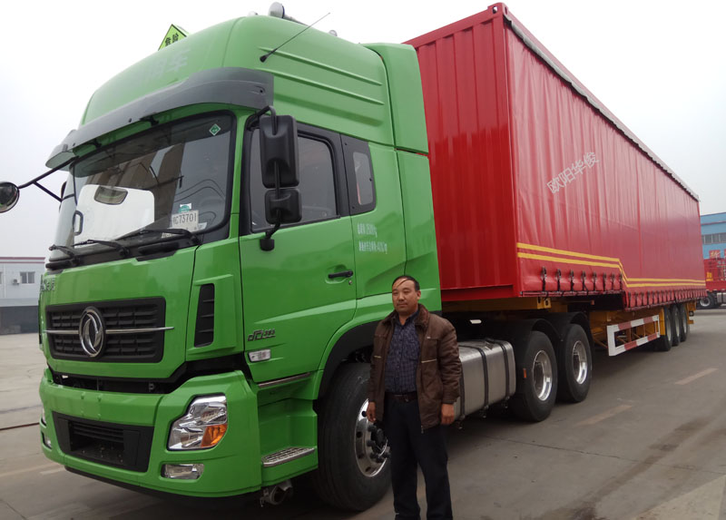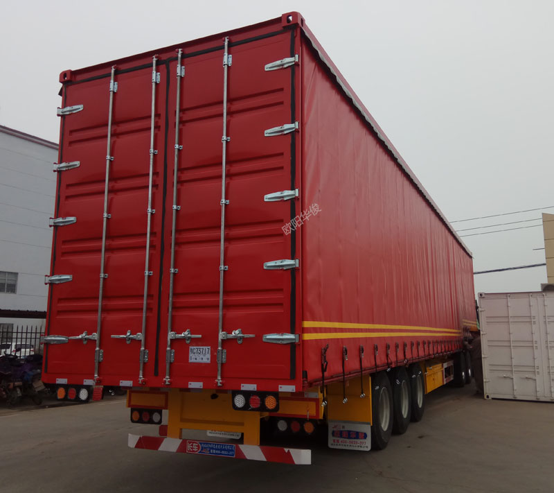 3臺(tái)骨架半掛車配直梁式側(cè)簾篷布廂式半掛車完工交付給客戶張總,骨架半掛車顏色為工程黃,篷布側(cè)簾車廂為紅色。此骨架半掛車的尺寸為:13.95米長(zhǎng)×2.5米寬;上裝篷布車廂尺寸為:15.2米長(zhǎng)×2.6米寬×2.75米內(nèi)高。后門為廂式對(duì)開(kāi)門,廂體內(nèi)打井字形隔開(kāi),每邊焊15個(gè)臥環(huán)。該車廂曾經(jīng)成為國(guó)外公路貨物運(yùn)輸中的主導(dǎo)車型,也是當(dāng)前廂式運(yùn)輸車開(kāi)展的一大趨向。