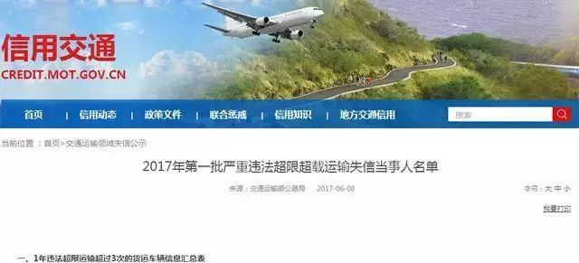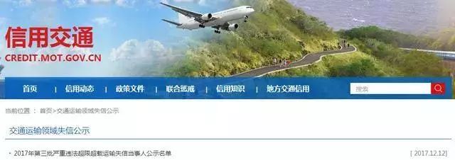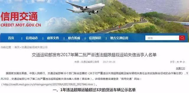 發布日期:2017-12-23 02:13:27 編輯:歐陽華俊 瀏覽量:4514根據交通運輸部等36個部門聯合簽署的《關于對嚴重違法失信超限超載運輸車輛相關責任主體實施聯合懲戒的合作備忘錄》,交通部分別于6月8日,9月28日,12月11日發布三批嚴重違法超限超載失信當事人信息(黑名單)。
