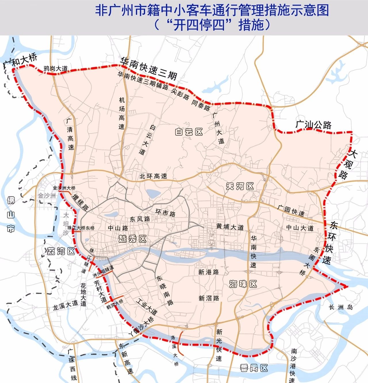 廣州市大觀路(廣汕路至中山大道段,不含)、東環(huán)城市快速路(中山大道至東圃大橋段,不含)、珠江水道(東圃大橋至長洲島至丫髻沙大橋至廣和大橋段,海珠區(qū)南面、長洲島和番禺區(qū)北面、海珠區(qū)和白云區(qū)西面、大坦沙和金沙洲東面),鴉崗大道(不含)、華南快速干線三期(鴉崗大道至春崗立交段,不含)、華南快速干線三期輔路(不含)、尖彭路(不含)、同泰路(不含)、廣州大道北(同泰路以北段,不含)、華南快速干線二期(春崗立交段至廣汕路段,不含)、廣汕路(大觀路至華南快速干線段,不含)合圍的區(qū)域,以及進入上述區(qū)域的洛溪大橋、鶴洞大橋、洲頭咀隧道、珠江隧道、珠江大橋東橋、金沙洲大橋。