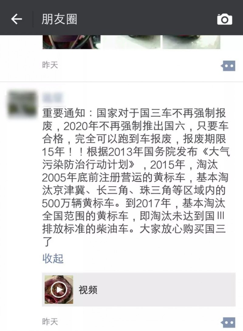 今天小編收到卡友發來的消息:國家對于國三不再強制報廢!2020年不再強制推出國六!卡友將他朋友圈掛靠公司發的很新國三消息發送給了小編!如下圖↓↓↓