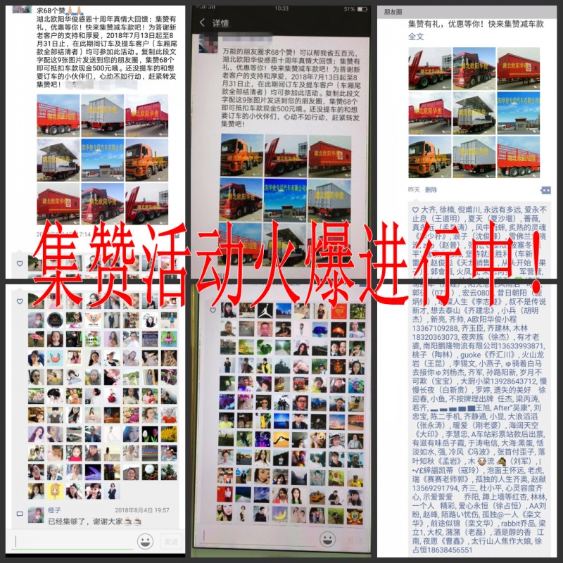 湖北歐陽華俊感恩十周年真情大回饋:集贊有禮,優惠等你!快來集贊減車款吧!為答謝新老客戶的支持和厚愛,2018年7月13日起至8月31日止,在此期間訂車及提車客戶(車廂尾款全部結清者)均可參加此活動。復制此段文字配這9張圖片發送到您的朋友圈,集贊68個即可抵扣車款現金500元哦。還沒提車的和想要訂車的小伙伴們,心動不如行動,趕緊轉發集贊吧!