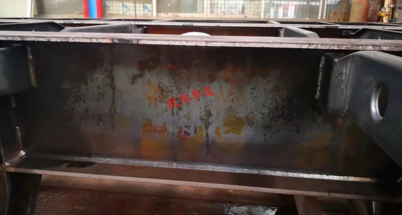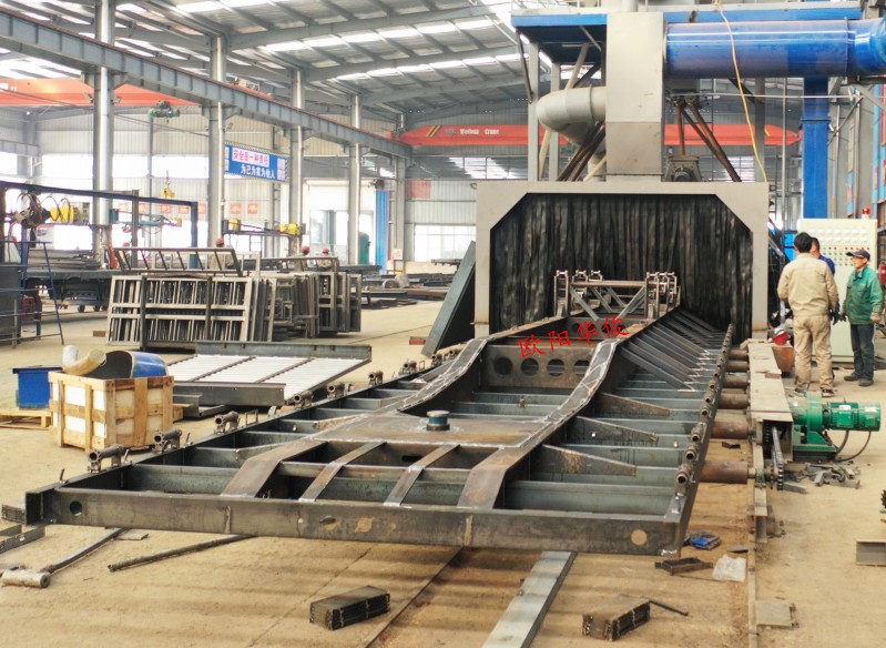 華俊新增大型自動噴砂生產線第二條:處理半成品車廂底架。