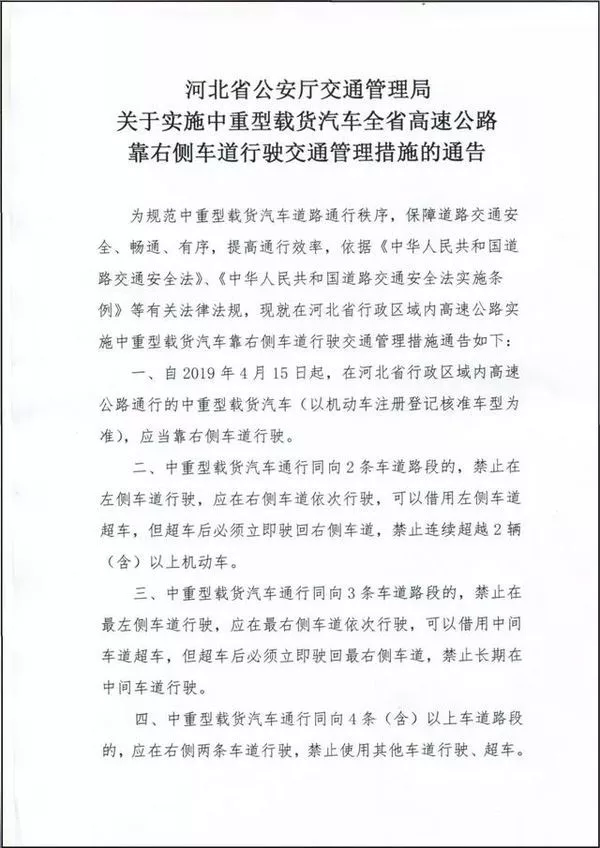 近日,河北省公安廳交通管理局發布《關于實施中重型載貨汽車全省高速公路靠右側車道行駛交通管理措施的通告》,公告指出,自4月15日起在全省高速公路開展“貨車右行”交通管控行動。