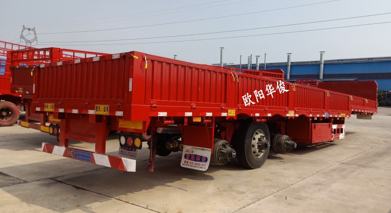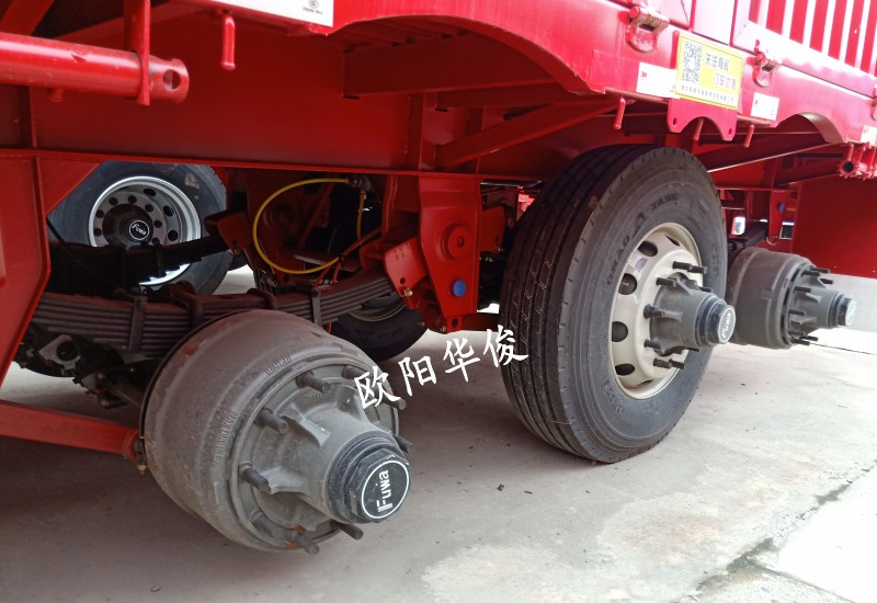 此車13.75米長×3米寬,配等寬戶口一套,顏色:華俊大紅,28T單動支腿,廣東富華13T車橋,16T剎車,板簧:10×13,底板:2.5mm花紋板,貫穿梁8#槽鋼,鋪9根底槽,可走叉車及拉重載。