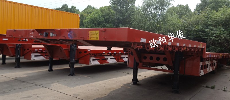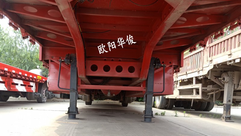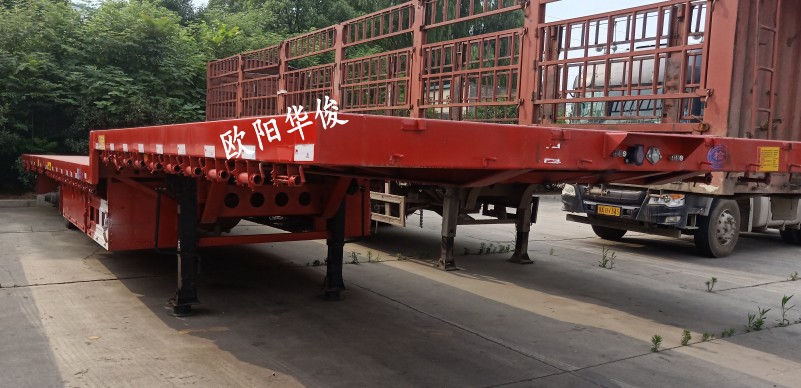 此車(chē)13.75米長(zhǎng)×3米寬,配等寬戶(hù)口一套,顏色:華俊大紅,28T單動(dòng)支腿,廣東富華13T車(chē)橋,16T剎車(chē),板簧:10×13,底板:2.5mm花紋板,貫穿梁8#槽鋼,鋪9根底槽,可走叉車(chē)及拉重載。
