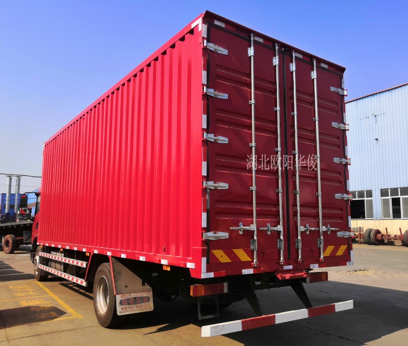 整車為全封閉式集裝箱,左邊不開門,右邊開一對2.5米寬的對開門,后尾也設(shè)為廂式對開門,方便裝卸貨物。