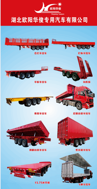 湖北歐陽華俊專用汽車有限公司始建于2008年,經過10多年的辛勤開拓,已經形成了立足湖北棗陽、深入全國各省、拓展海外的戰略格局。現有員工200余人,占地面積3萬多平方米,是一家具有國家公告資質的專用車生產企業。主營產品有倉欄、平板、飛翼、廂式、自卸、特種車和出口車等車型。