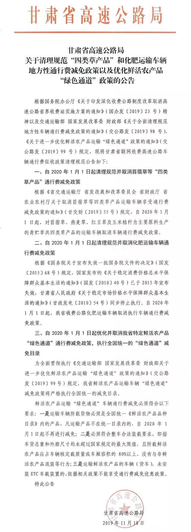 從2020年1月1日起,我省將取消化肥運輸車輛減免政策,取消苜蓿草等"四類草"減免政策,取消我省特定鮮活綠色通道減免政策,執(zhí)行全國統(tǒng)一"綠色通道"減免目錄。