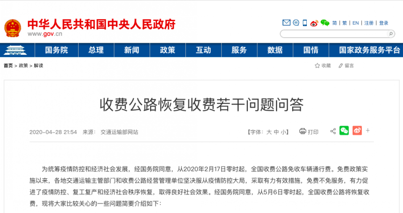 發(fā)布日期:2020-04-29 04:25:04 編輯:歐陽華俊 瀏覽量:1547交通運輸部發(fā)布:經國務院同意,恢復全國收費公路收費。現(xiàn)將有關事宜公告如下: