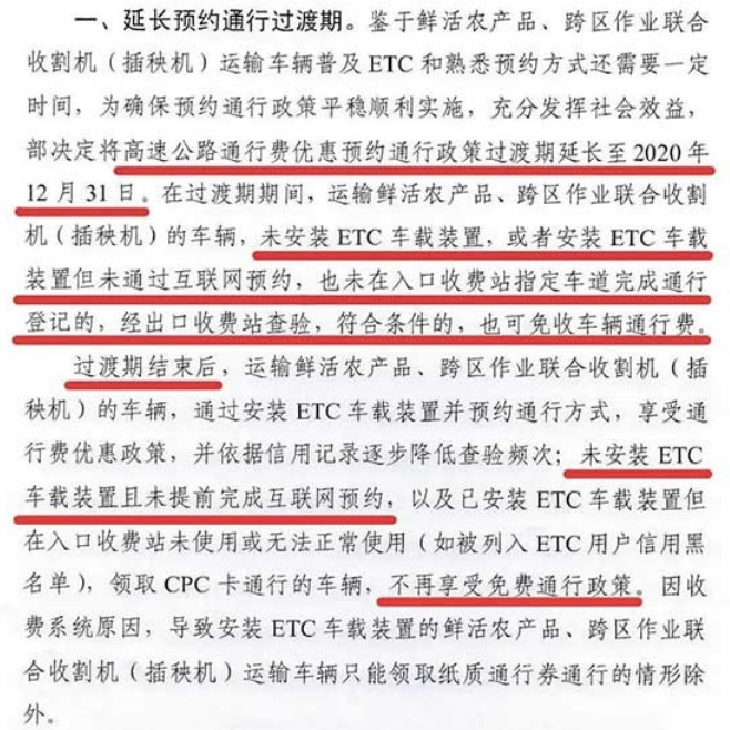 過渡期期間,運輸鮮活農產品、跨區作業聯合收割機(插秧機)的車輛,未安裝ETC車載裝置,或安裝ETC車載裝置但未通過互聯網預約,也未在入口收費站指定車道完成通行登記的,經出口收費站查驗,符合條件的,也可免收車輛通行費。