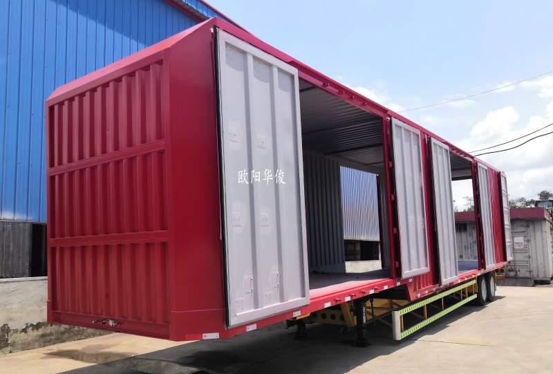 左側門數量2對,2.7米寬,高板一個,低板一個。右側門數量1對,2.7米寬,低板一個,公告設計,量身定制,開關門方便快捷。貨物快速裝卸,提高效率,節約成本。
