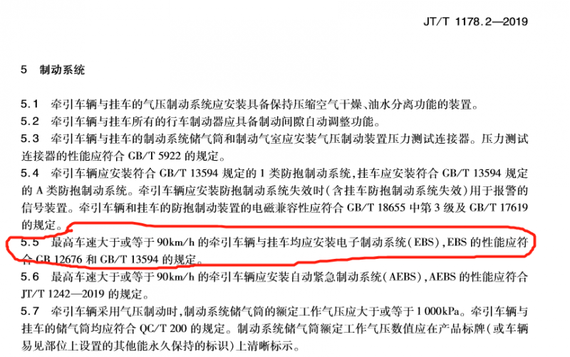 6、標準5.5條款,很高車速大于或等于90km/h的牽引車輛與掛車,均應安裝電子控制系統(EBS);