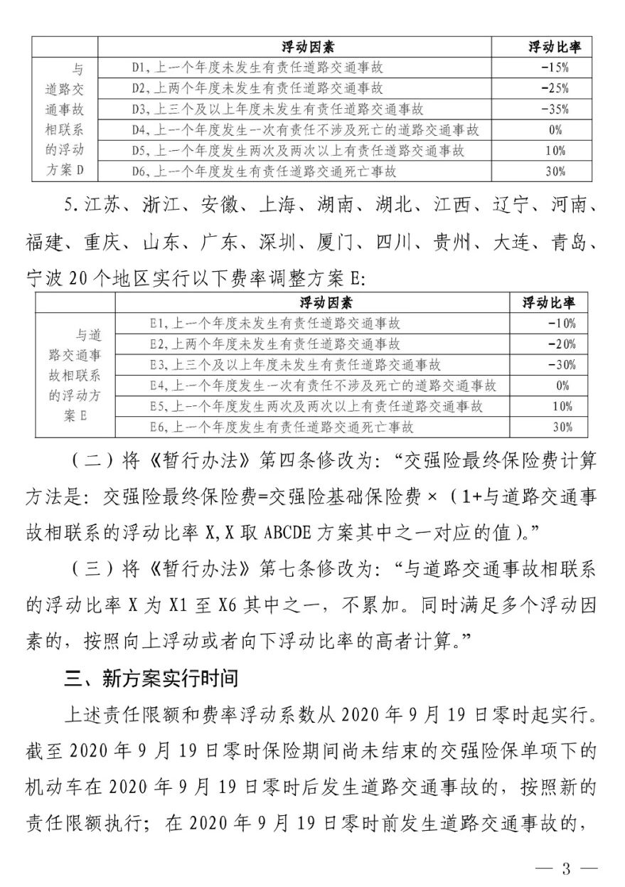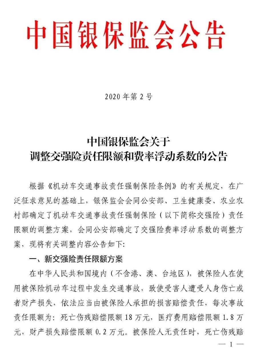 發布日期:2020-09-20 03:30:58 編輯:歐陽華俊 瀏覽量:20372020年9月9日,中國銀保監會發布《關于調整交強險責任限額和費率浮動系數的公告》(2020年第2號),將于2020年9月19日正式實施。《公告》明確,2020年9月19日零時后發生道路交通事故的,新、老交強險保單均按照新的責任限額執行。