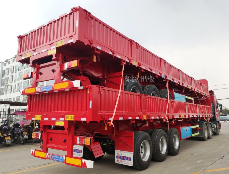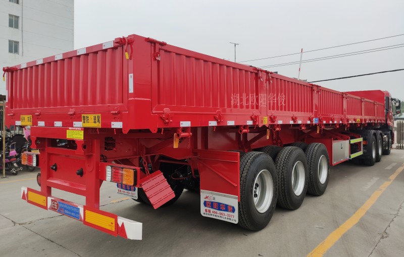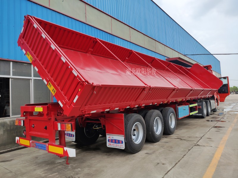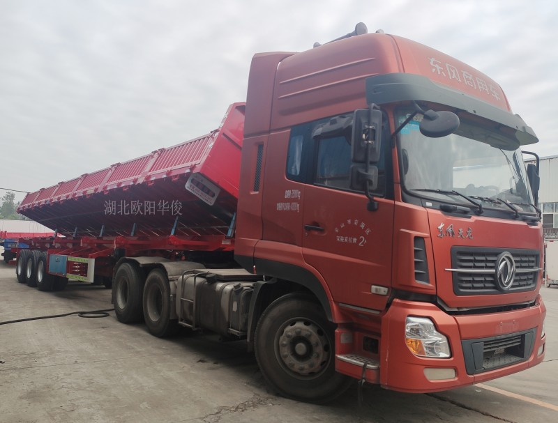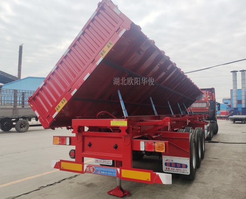 側翻自卸半掛車:可有效地提高裝卸機運輸散裝零散貨物的運輸效率,自卸式半掛車適用于煤炭、礦石、泥沙、建筑物料等散裝零散貨物的運輸。