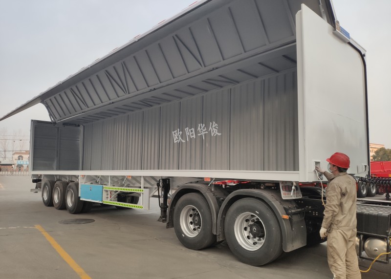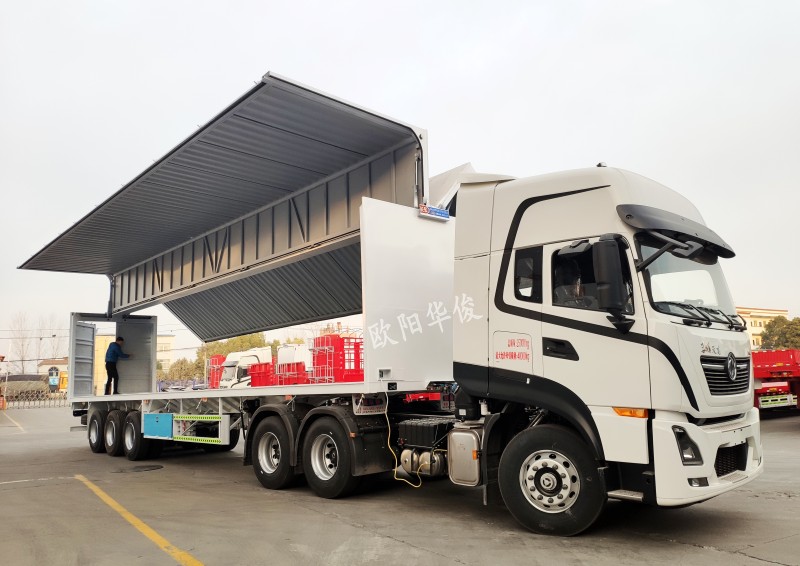 此飛翼半掛尺寸為:13.75米長×2.55米寬×4米(離地高),開啟方式為:全飛式,采用進口動力單元,鹽城油頂,車廂采用內封鍍鋅板,外掛瓦楞板,頂部加防水篷布,帶防水槽,底板采用花紋板,外表防滑,美觀耐用,貨物運輸安全可靠。