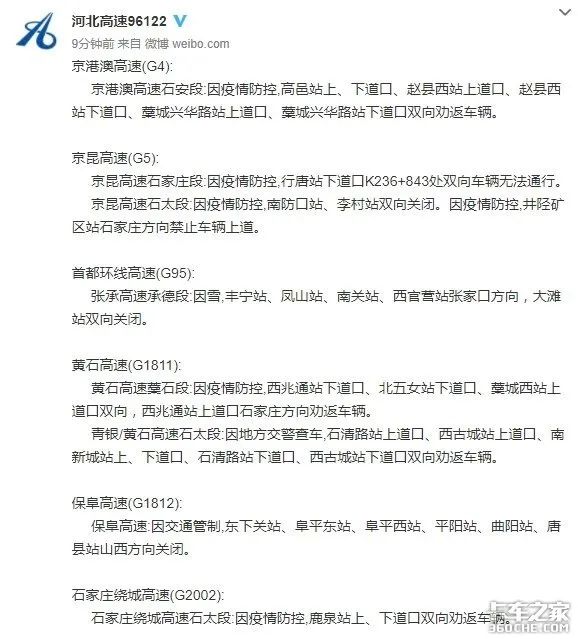京港澳高速石安段:因疫情防控,高邑站上、下道口、趙縣西站上道口、趙縣西站下道口、藁城興華路站上道口、藁城興華路站下道口雙向勸返車輛。