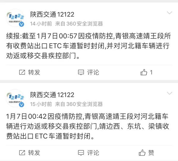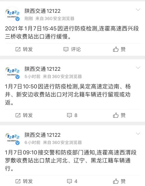 因進(jìn)行防疫檢測(cè),吳定高速定邊南、楊井、新安邊收費(fèi)站出口對(duì)河北籍車輛進(jìn)行留觀或勸返。連霍高速西渭段羅敷收費(fèi)站出口禁止河北、遼寧、黑龍江籍車輛通行。