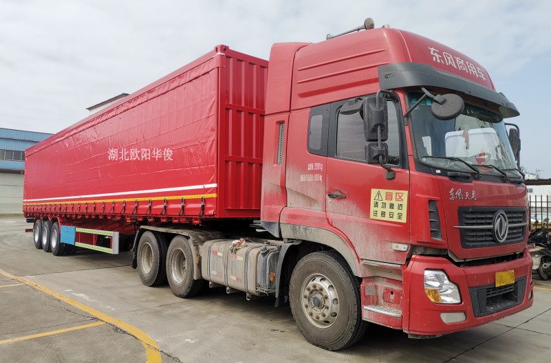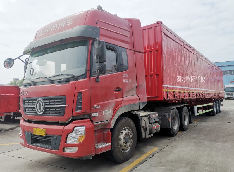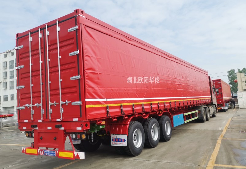 2臺完工發(fā)車的骨架半掛車配篷布側(cè)簾車廂在歐陽華俊廠區(qū)格外的養(yǎng)眼,靚麗,別具一格。