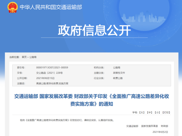 日前,交通運輸部、國家發(fā)展改革委、財政部三部門發(fā)布《全面推廣高速公路差異化收費實施方案》的通知,表示要:全面推廣高速公路差異化收費,降低高速公路出行成本。2021年9月底前是組織實施階段。