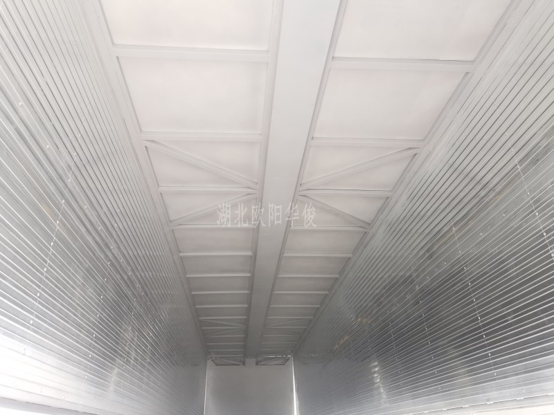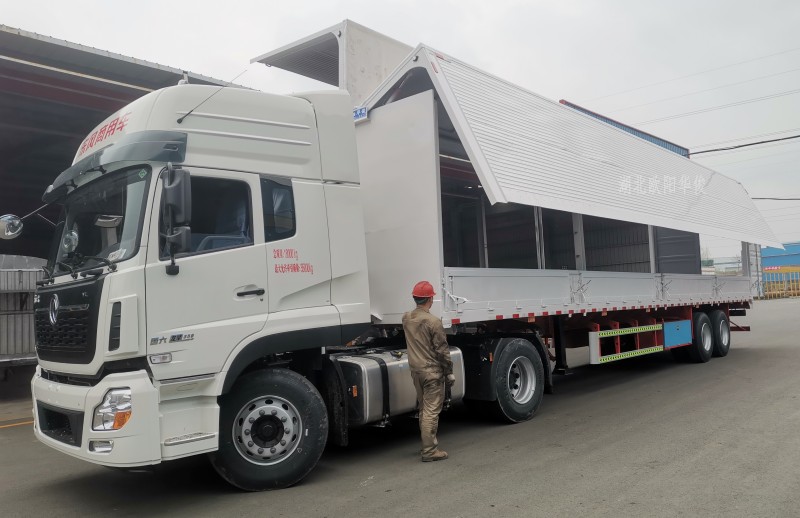 歐陽華俊生產的飛翼半掛車,在頂部做的是三層加厚的防水篷布,防水效果特別好。底板采用花紋板或竹木底板,帶防水槽,外表防滑,美觀耐用,貨物運輸安全可靠。
