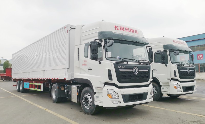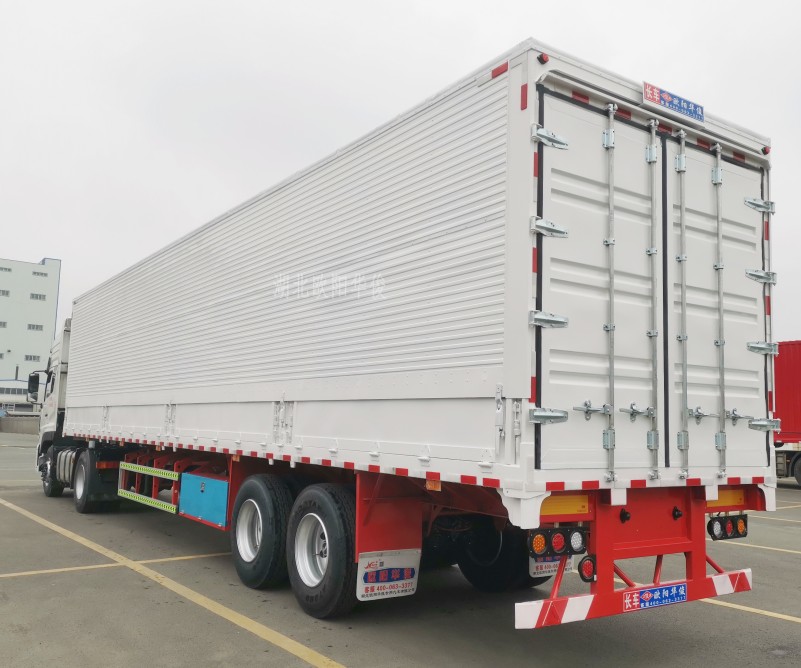 此飛翼半掛尺寸為:13米長×2.55米寬×4米(離地高),內部尺寸:12.7米長×2.45米寬×2.41米內高,開啟方式為:(帶墻板)全飛式,車廂采用內封鍍鋅板,外掛瓦楞板,立柱自折件還設計有防撞膠塊。