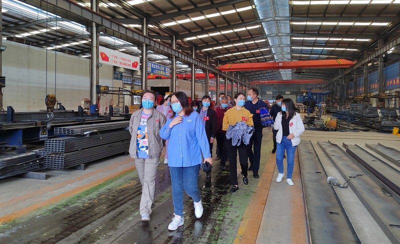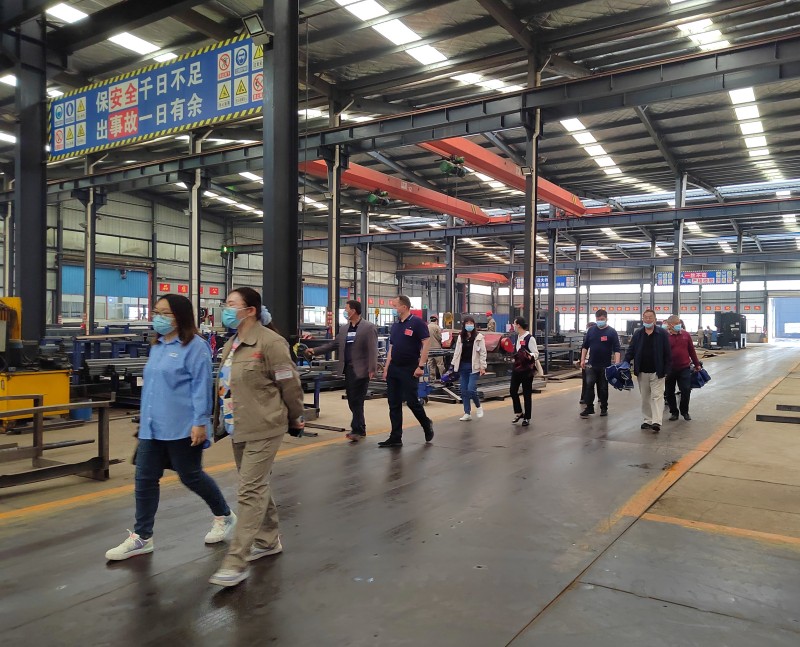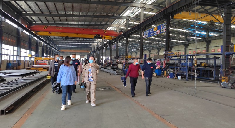 各人大代表領導們參觀2號車間的生產狀況,了解了2號車間是裁料車間和大型激光切割、自動化焊接生產線,知道了自動化焊接和激光切割的優點。