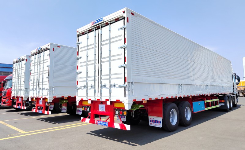 歐陽華俊三臺13米兩軸飛翼半掛車交付天津某物流公司,帶墻板的全飛樣式,拉氣車配件的好幫手