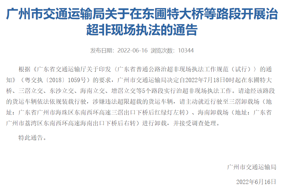 2022年7月18日0時起在東圃特大橋、三滘立交、東沙立交、海南立交、增滘立交等5個路段實行治超非現(xiàn)場執(zhí)法工作。