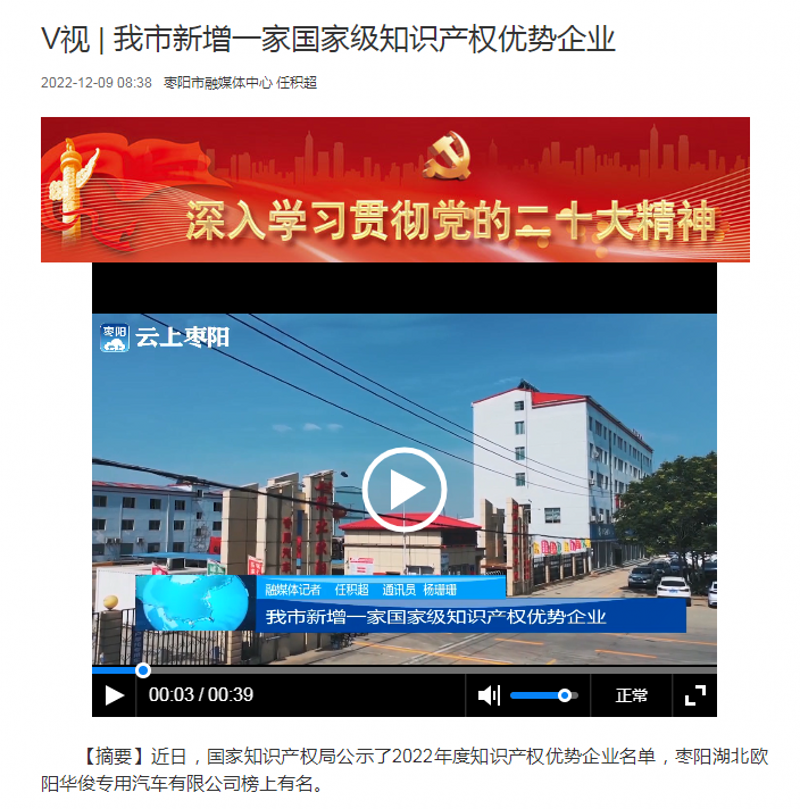 湖北歐陽華俊專用汽車有限公司此次能夠在行業內脫穎而出,成功入圍國家知識產權優勢企業,充分彰顯了企業的科技創新實力,持續提升企業核心競爭力、聚焦創新驅動及精準提升服務效能上的有效成果。