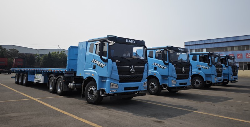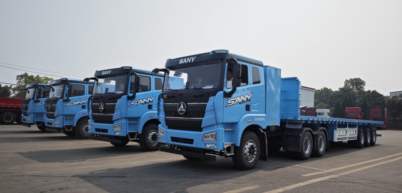 三一重卡電動牽引車頭搭載歐陽華俊13米拉玻璃專用平板半掛車,組成高效新能源物流組合。首批4臺已完成整備,鳴笛啟程,"奔向財富大道"。