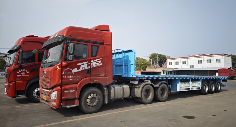 湖北荊州和廣東清遠老板訂購的13米直梁平板,也已完成整備,鳴笛啟程,"奔向財富大道"。