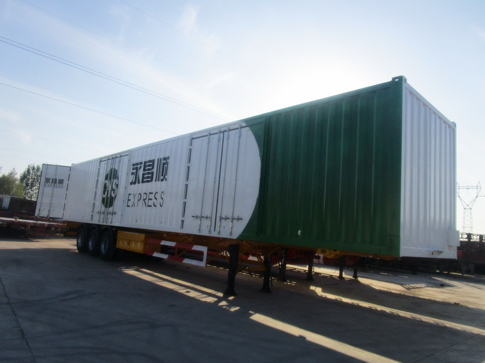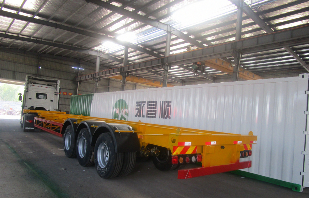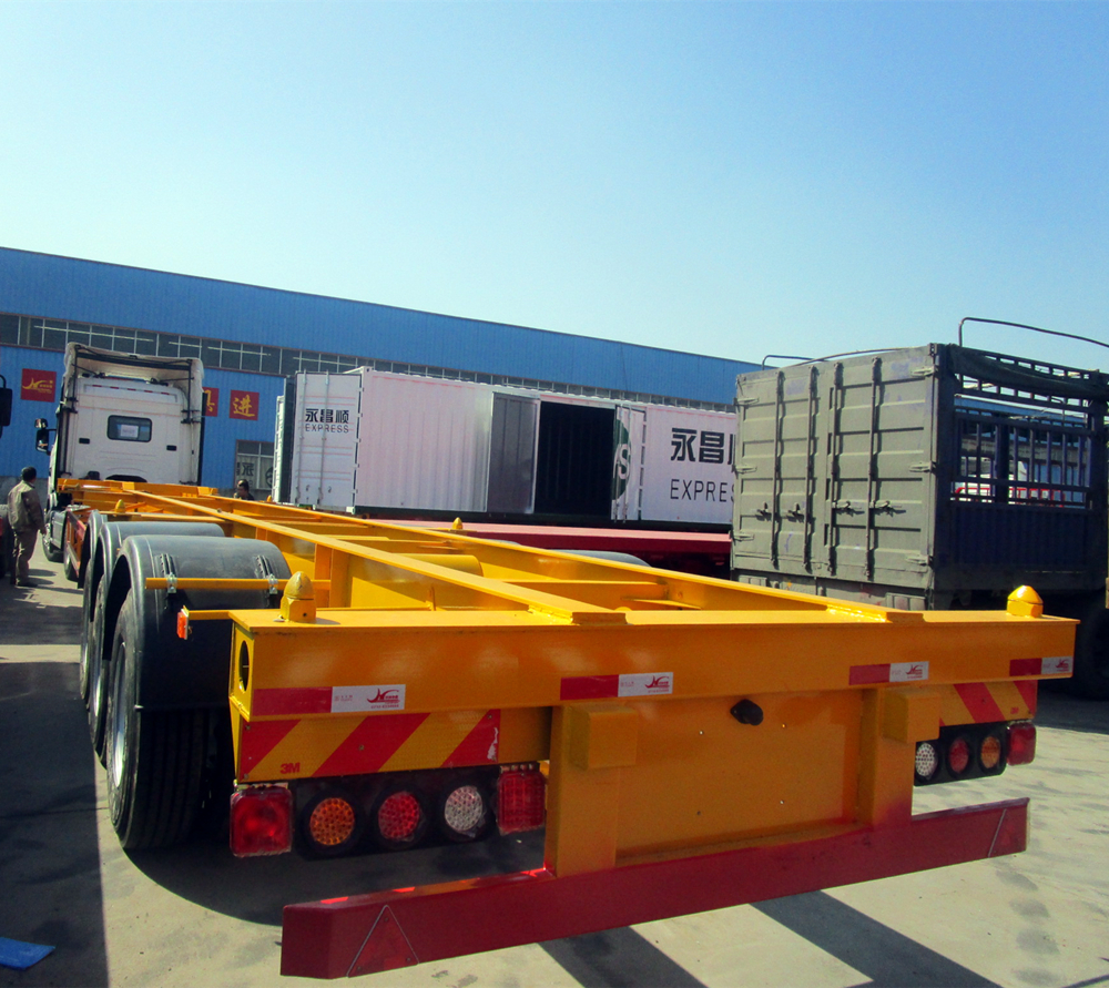 骨架式集裝箱半掛車即載貨部位為集裝箱結構的半掛車,主要有40英尺骨架、45英尺骨架等,一般都帶有鎖具。