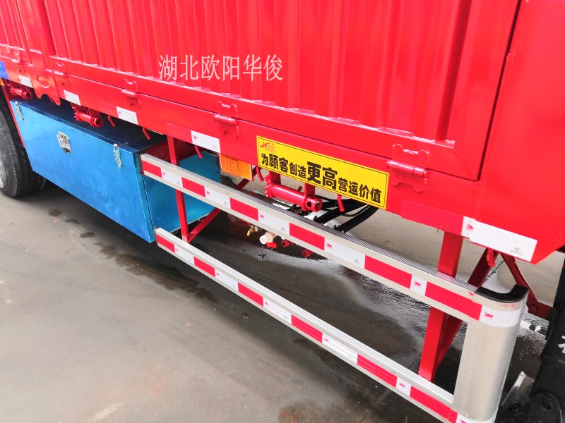 備注 車輛整車高度分別為3950mm,3750mm,3550mm,3350mm,3150mm一一對應車廂底板至倉柵頂部的高度為2600mm,2400mm,2200mm,2000mm,1800mm;整車選裝各種倉柵樣式為一層倉柵,二層倉柵,三層倉柵,前后弧板及前爬梯為選裝件,可選對開門外置鎖桿,外置半截鎖桿,或對開門內置鎖桿,內置半截鎖桿;整車貨廂欄板選裝豎瓦楞,方管平板,方管十字花樣式及四開,五開,六開,選裝合頁下移結構;立柱可選內插,外插樣式。一,ABS:型號: CM2XL-4S/2K(4S/2M);生產廠家: 廣州市科密汽車制動技術開發有限公司, 二,側面裝置:材料均采用Q345,與車輛連接方式為螺栓連接,后防護截面尺寸:140X55,離地高度為500mm.