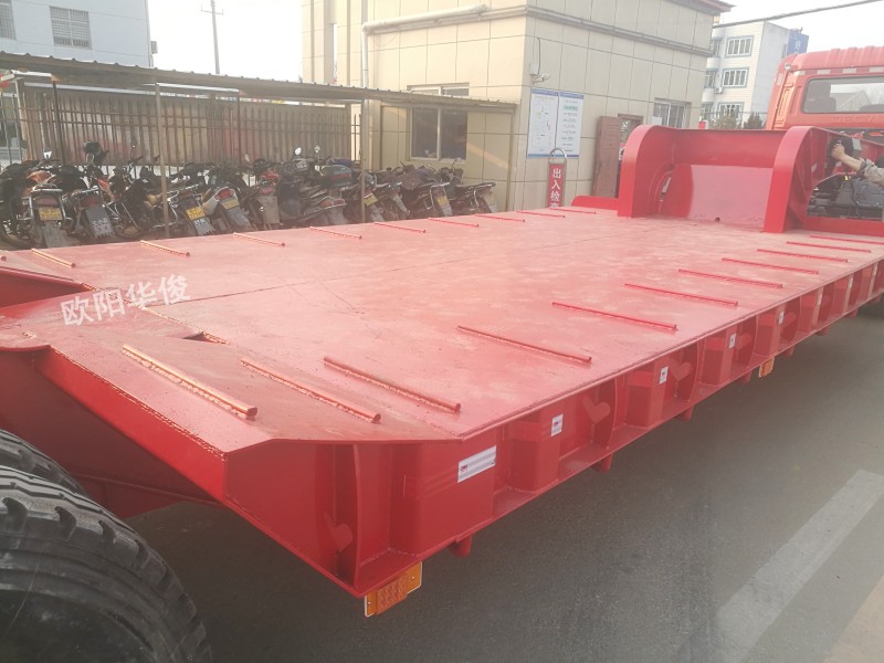 【結構設計】:采用高彈性實心胎、能增強拖車承載能力和使用壽命,減輕行駛過程中車輛顛跛對貨物造成的損傷;采用雙懸浮式回轉支架,可自行調整平板車的平衡與穩定;各關節部位的銷軸材料均采用合金鋼,經特殊處理加工而成;設計合理,采用工字鋼主梁,增加承載力及提高整車的穩定性;使用框架機構制作,間距受力均勻;帶雙爬梯,帶雙彈簧,自動彈回,簡單方便。