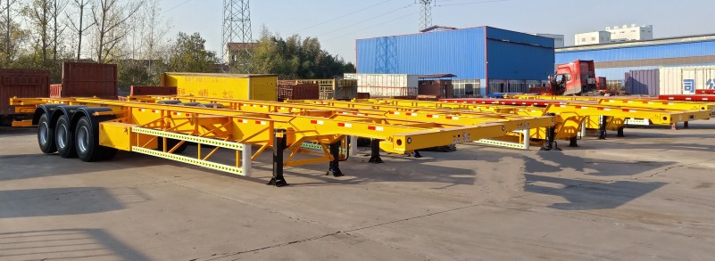 歐陽華俊45英尺黃色三軸骨架半掛完工批量交付湖北客戶啦!此骨架半掛車的尺寸為:13.95米長×2.55米寬,本公司生產的骨架式半掛車采用很佳的設計方案,結構合理,操作可靠,外觀優美,上面可配集裝箱,罐子類使用,發揮整車的很大潛能。 本