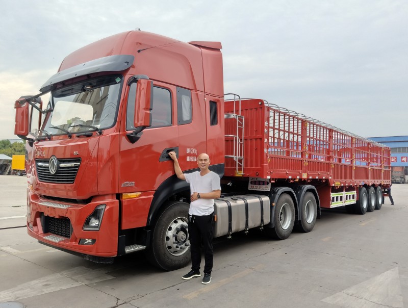自古逢秋悲寂寥,我言秋日勝春朝,看著歐陽華俊廠區內每天一片繁忙景象,這不正代表著收獲和希望嘛!一大早河南區域的林總駕駛新提的東風天龍KL465馬力牽引車頭來歐陽華俊掛新訂的同色系1.6米高高欄,即將離廠,奔赴財富大道! 客戶熱情的和愛車合影紀念