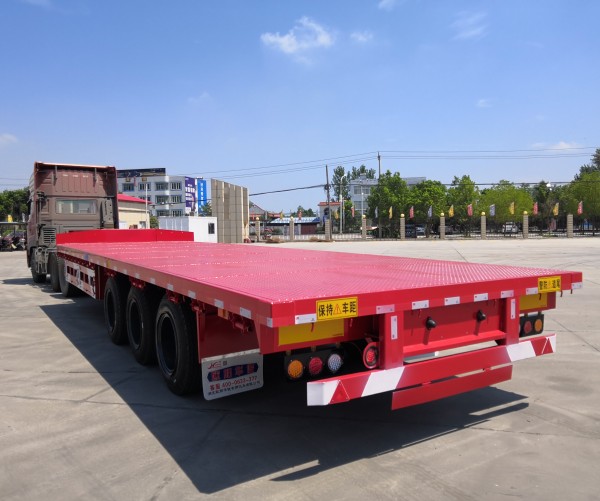 在歐陽華俊廠區,除常規車型倉欄半掛銷量穩居第一之外,13.75米長*3米寬平板半掛車也是銷售熱度持續不減,廣受好評。 歐陽華俊