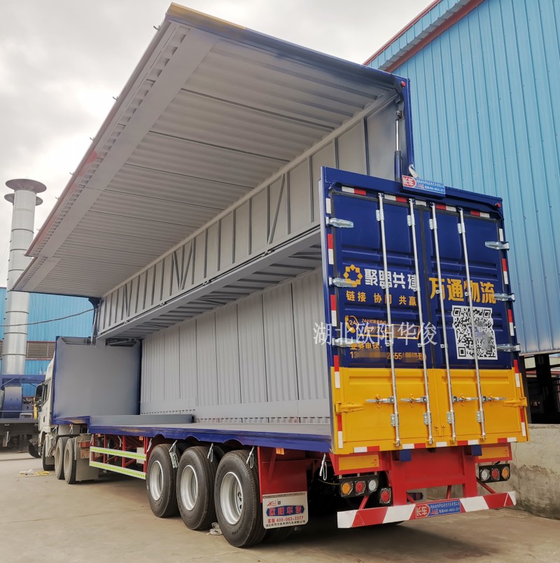 河南朋友在湖北歐陽華俊定做多臺飛翼半掛車,是歐陽華俊超級鐵粉,感謝劉總的支持和關注,漂亮的13.75米高低飛翼半掛車完工交付啦!大鵬展翅之雄志,祝卡友們展翅高飛,心想事成!大鵬一日同風起,扶搖直上九萬里! 對翼開啟廂式半掛車,歐陽華俊還可定制生產12米、12.5米