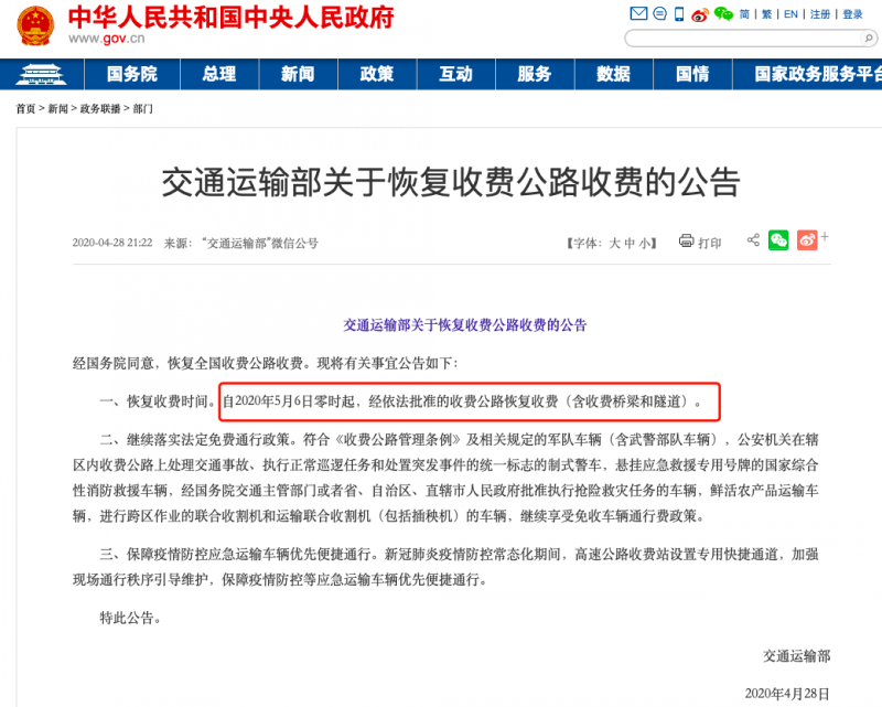交通運輸部發(fā)布:經(jīng)國務(wù)院同意,恢復(fù)全國收費公路收費。現(xiàn)將有關(guān)事宜公告如下: 一、恢復(fù)收費時間。自2020年5月6日零時起,經(jīng)依法批準(zhǔn)的收費公路恢復(fù)收費(含收費橋梁和隧道)。 二、繼續(xù)落實法定免費通行政策。符合《收費公路管理