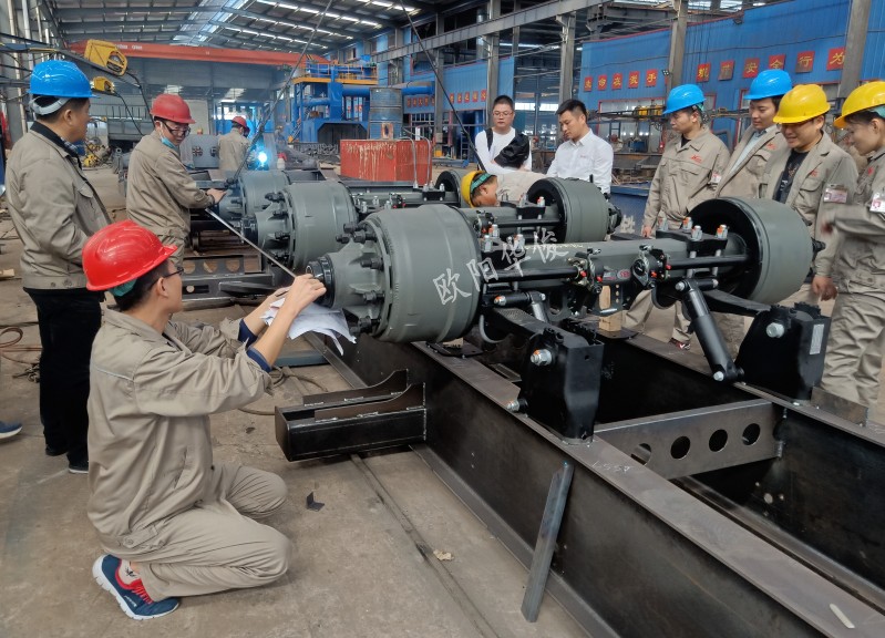 根據(jù)《GB7258-2017》的要求,從2020年1月1日起,三軸欄板式、倉(cāng)柵式半掛車應(yīng)裝備盤(pán)式制動(dòng)器。同時(shí),總質(zhì)量大于12000kg的三軸欄板式、倉(cāng)柵式半掛車都應(yīng)裝備空氣懸掛。歐陽(yáng)華俊為了生產(chǎn)工藝很優(yōu)化進(jìn)行改進(jìn)提升,特邀請(qǐng)多家知名品牌車橋?qū)I(yè)技術(shù)人員到廠區(qū)進(jìn)行技術(shù)交流與指導(dǎo)。